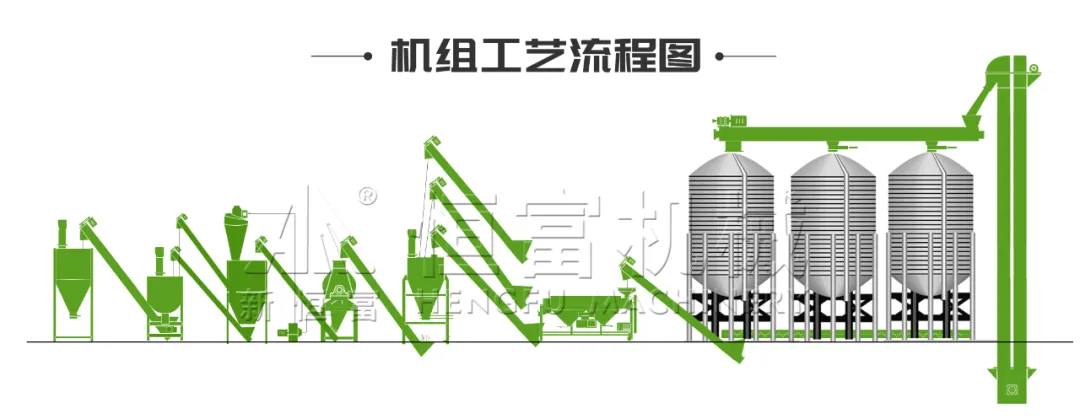 主机部分包含:水滴式粉碎机、单轴双螺旋混合机、除霉机、配料秤、缓冲仓、成品仓、PLC电控系统以及各种输送设备等。